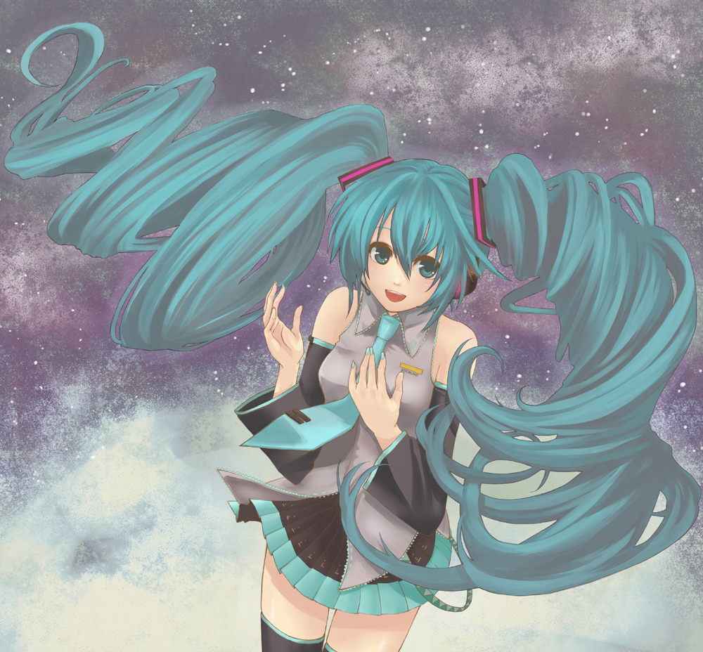 1girlaqua eyesaqua hairdetached sleevesfemale focusheadphonesheadsetlong hairnecktieskirtsolothighhighstwintailszettai ryouiki