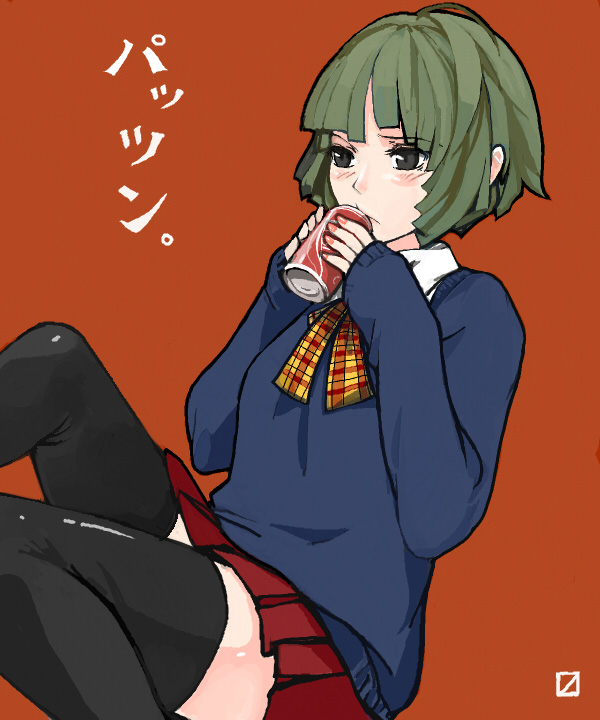 1girlblack thighhighscandrink canfemale focusgreen hairgrey eyesnail polishorange backgroundpink nailspleated skirtschool uniformshort hairsimple backgroundsittingskirtsoda cansolosweaterthighhighszettai ryouiki