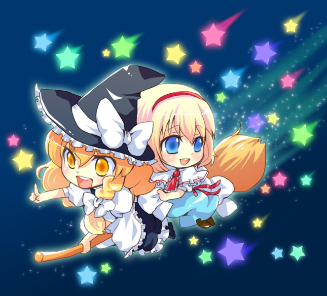 2girlsblonde hairblue eyesbraidbroombroom ridingbrown themechibifemale focushairbandhatmultiple girlsmultiple ridersshort hairstar (symbol)witchwitch hatyellow eyes