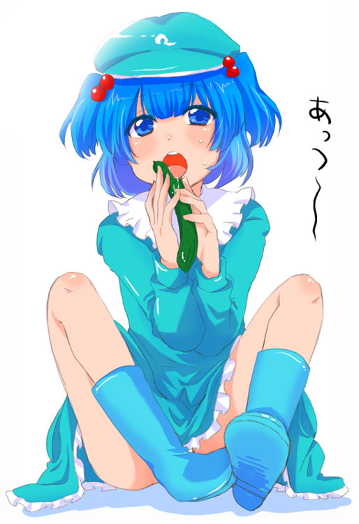 1girlblue eyesblue hairbootscucumberfemale focushair bobbleshair ornamenthatlickingmatching hair/eyessexually suggestiveshort hairsolotwo side up
