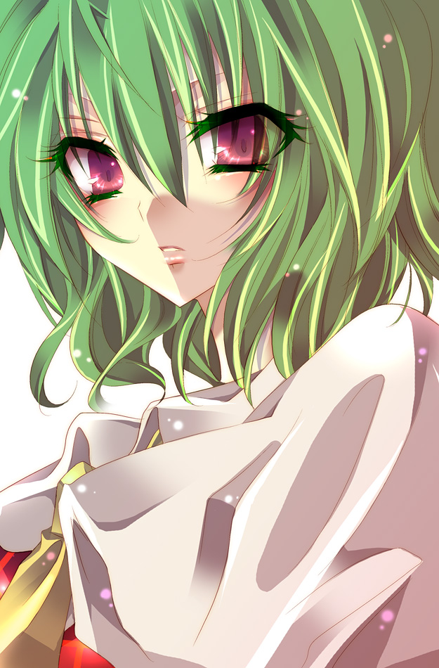 1girlascotblushclose-upfemale focusgreen hairlipsnecktieparted lipsplaid clothesplaid vestportraitpurple eyesshort hairsolovest