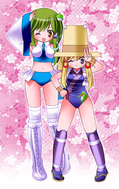 2girlsarm upbare shouldersblonde hairblue eyesbootsbreastsdetached sleevesfemale focusfrogfrog hair ornamentgreen hairhair ornamenthair ribbonhair tubeshatknee bootslarge breastslong hairmedium breastsmultiple girlsone eye closedopen mouthribbonsandalsshort hairsidelockssmilesnaketabivwrestling outfitwristbandyellow eyes