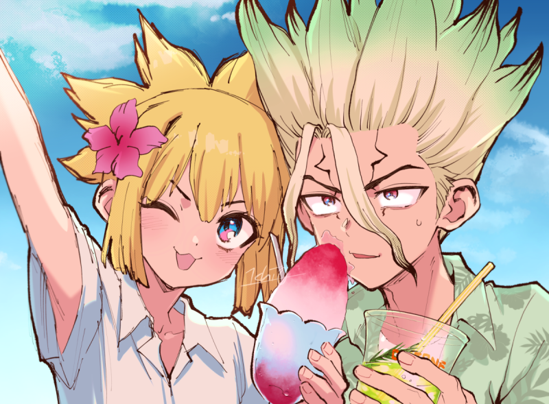 1boy1girlarm upblonde hairblue eyescollared shirtcupdisposable cupflowerfoodgradient hairgreen hairgreen shirthair between eyeshair flowerhair ornamenthawaiian shirtholdingholding cuplooking at viewermale focusmulticolored hairone eye closedopen mouthoutdoorspink eyespink flowershaved iceshirtshort hairsignatureskysmilespiked hairsweatdroptonguetongue outupper bodywhite shirt