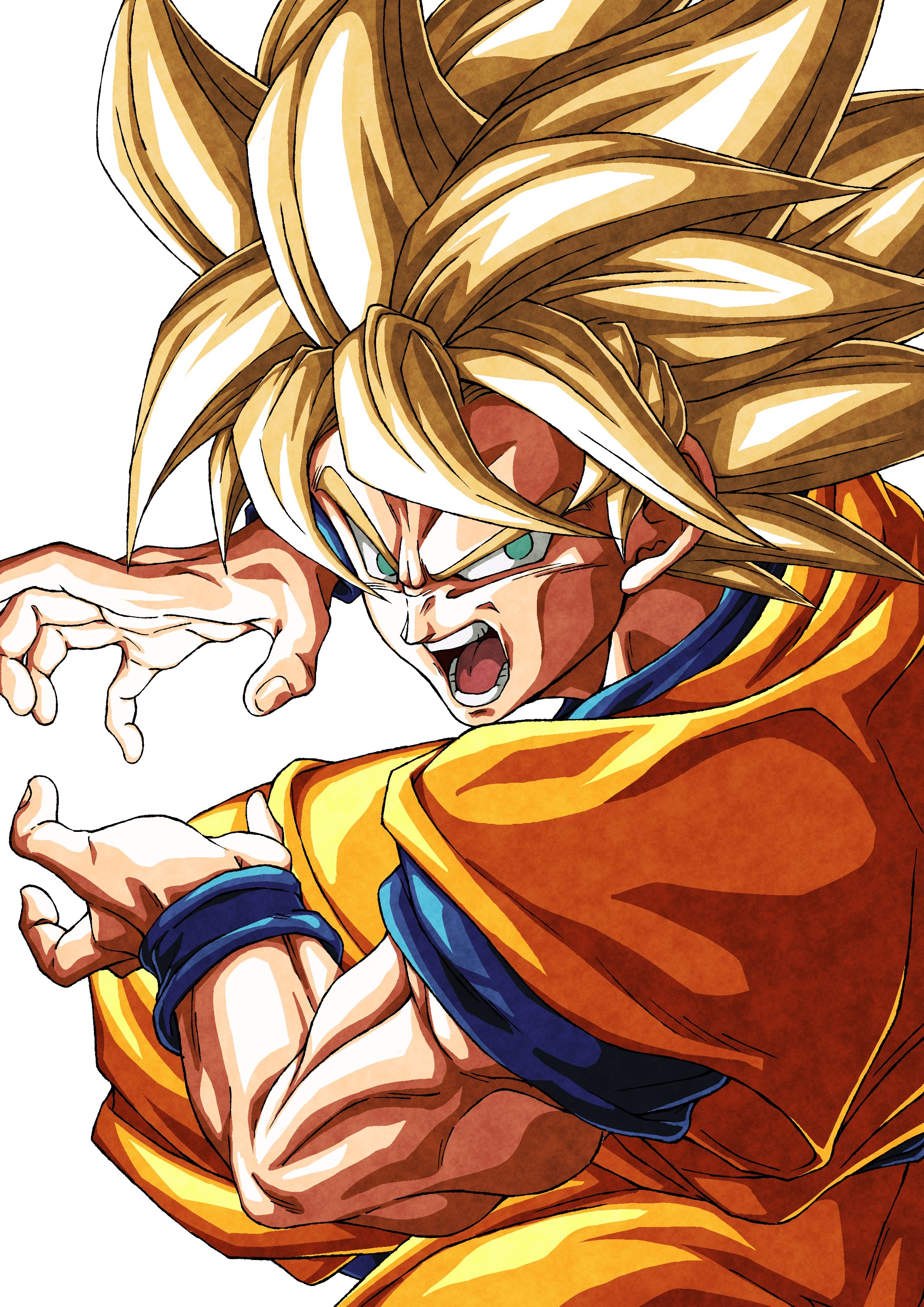 1boyblonde haircowboy shotgreen eyeskamehameha (dragon ball)male focusmedium hairopen mouthorange pantsorange shirtpantspoke ballshirtsimple backgroundsolospiked hairsuper saiyansuper saiyan 1ultra ballwhite background