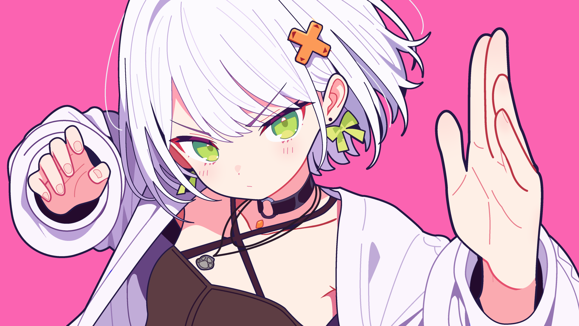 1girlblack chokerblushbowchokerclosed mouthd-padd-pad hair ornamentdot noseearringseyelashesfighting stancefingernailsgreen bowgreen eyeshair bowhair ornamentjacketjewelrykerinaharainilong sleevesmismatched eyebrowsnecklaceopen clothesopen jacketpink backgroundshort hairsimple backgroundsolov-shaped eyebrowsvirtual youtuberwhite hairwhite jacket