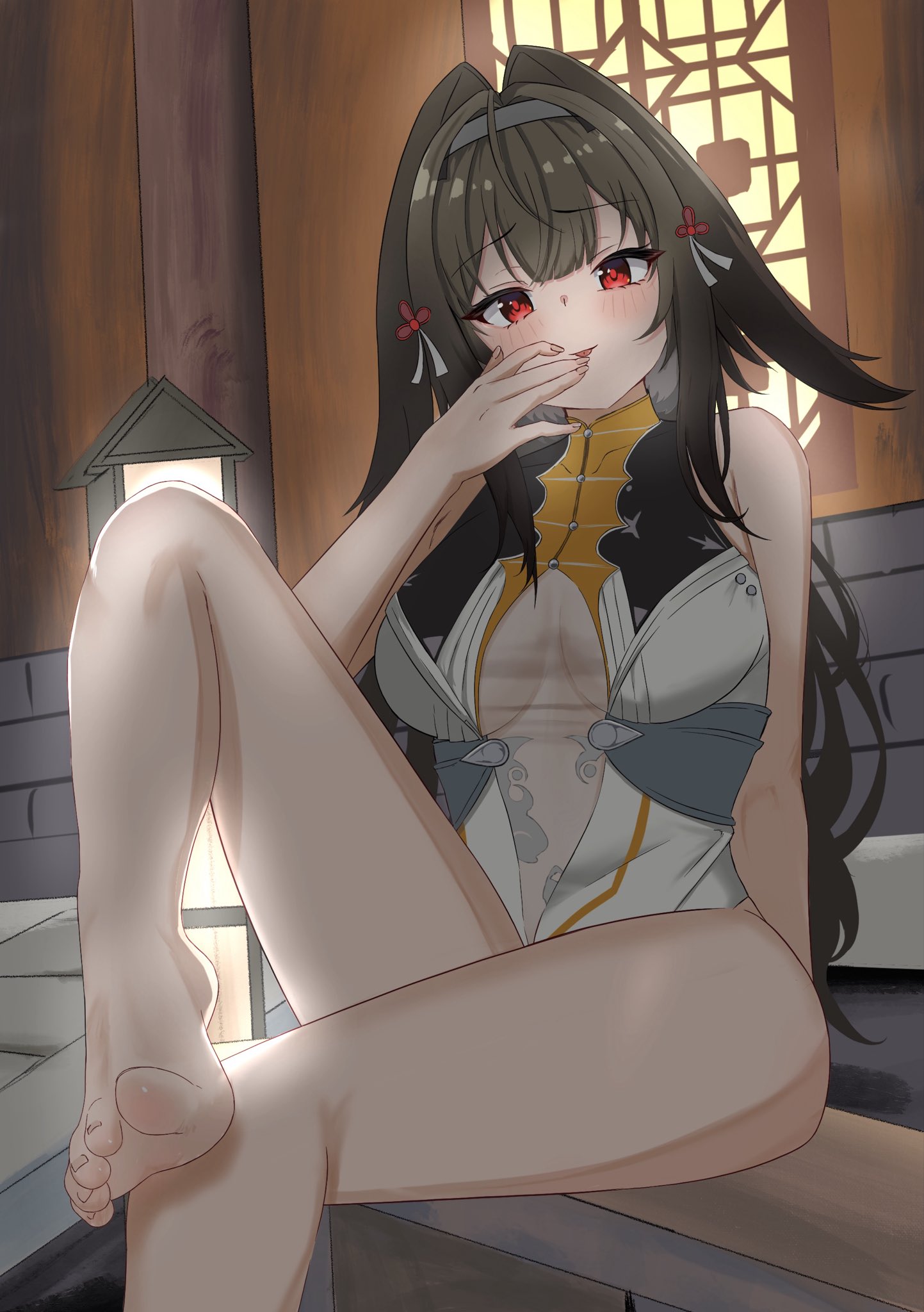 1girlbare shouldersbarefootblushbreastsbrown hairchina dresschinese clothescloverclover hair ornamentdressfinger to tonguefoot on own leggrey hairbandhair intakeshair ornamenthairbandlanternlong hairlooking at viewermedium breastsoutdoorsred eyessee-through clothessittingsleevelesssleeveless dresssolotoestonguewhite dress
