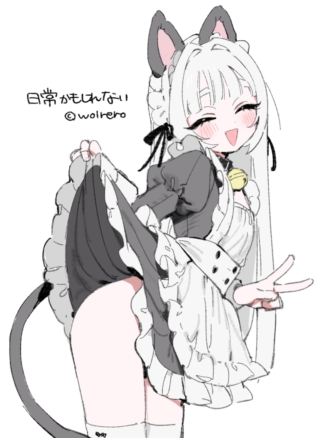 :d1girlanimal earsapronbellblack dressblack ribbonblushcat earscat tailclosed eyesclothes liftcontrappostodot nosedressfacing viewerfrilled apronfrilled dressfrillshair intakeshair ribbonhand uphead tiltjuliet sleevesleaning to the sidelegs togetherlifting own clotheslong hairlong sleevesmaidneck bellnichijou kamoshirenaiopen mouthpuffy sleevesribbonskirtskirt liftsmilesolostraight hairtailthighhighsthighsvvery long hairwhite apronwhite hairwhite thighhighswispy bangs