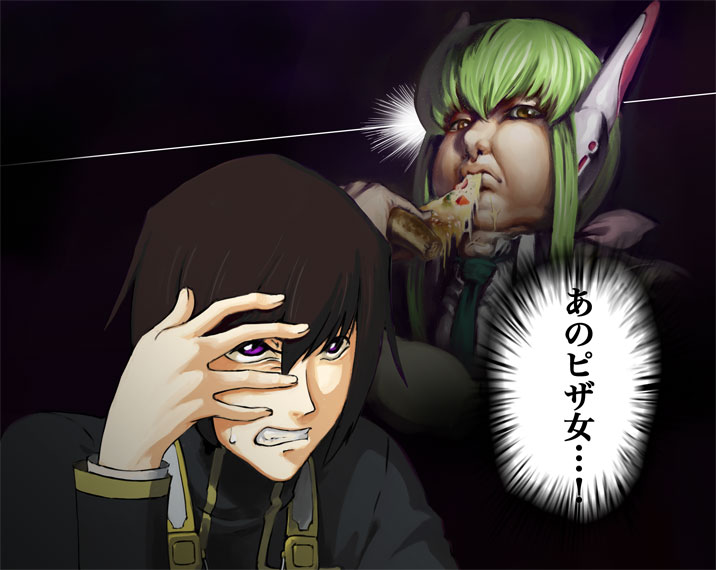 angrybrown haireatingfatfoodgreen hairparodypizzapurple eyesrealisticrobot earssurrealsweatdropyellow eyes
