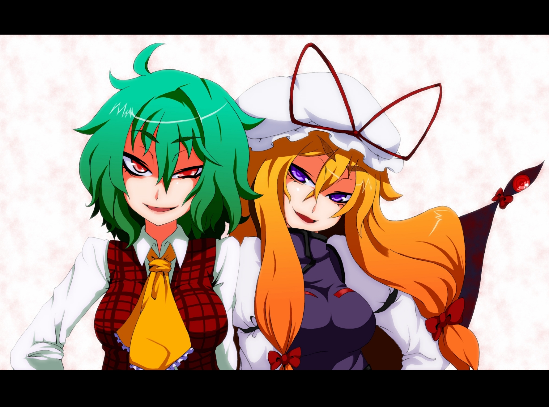 2girlsascotblonde hairbowbreastscrazy eyesevil grinevil smilefemale focusgap (touhou)green hairgrinhair bowhatlarge breastsletterboxedlong hairmultiple girlsplaid clothesplaid vestpurple eyesred eyesshort hairsmilevest