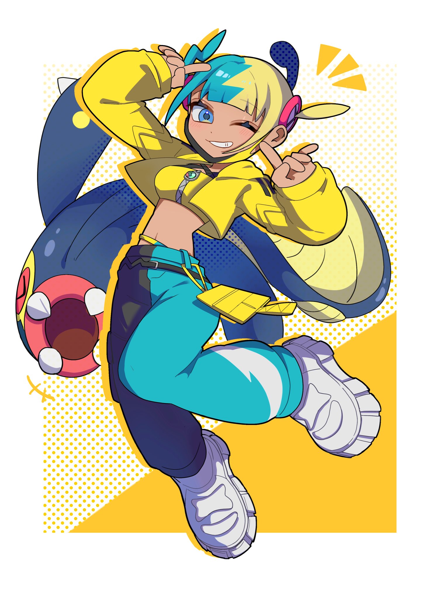 1girlaqua hairbandeaubeltblack beltblack maskblack pantsblonde hairblue eyesblue pantsblushbootsbreastscolored scleracriss-cross strapsdark skindark-skinned femaleeelfangsfishgen 5 pokemongrinjacketlampreylong sleeveslooking at viewermaskmask pullmega stonemouth maskmulticolored hairnavelone eye closedopen mouthpantspokingred sclerashort twintailssmilesplit-color hairsports bratwintailstwo-tone hairtwo-tone masktwo-tone pantswhite bootsyellow bandeauyellow jacketyellow maskyellow sports bra