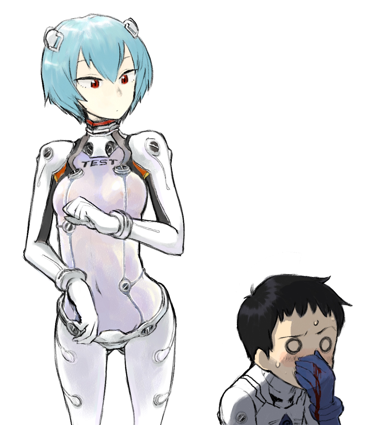 00s1boy1girlbloodblue haircocked eyebrowinterface headset (evangelion)mecha pilot suitnosebleedo oplugsuit (evangelion)raised eyebrowred eyesshort hairsimple backgroundtest plugsuit (evangelion)white background