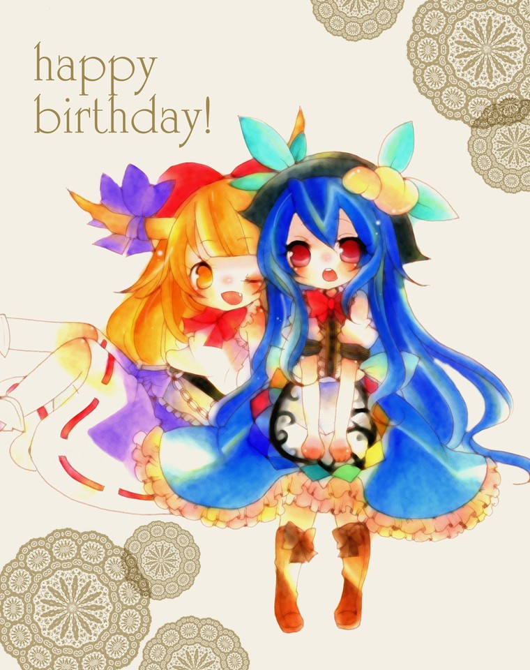 2girlsblue hairbootsfangfemale focusfoodfruithathornslong hairmultiple girlsone eye closedorange hairpeachred eyessittingwhite backgroundwink