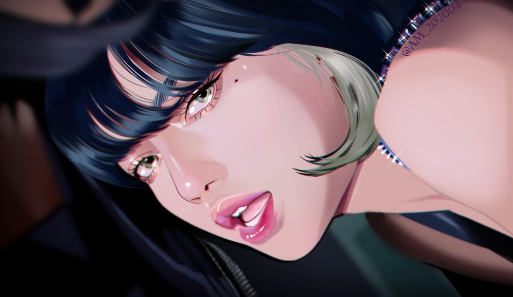 1girlblack eyelinerblack hairblunt bangsbob cutclose-upeyelinereyeshadowk-poplooking at viewermakeupmascaramoleopen mouthpink lipssolotwitter username