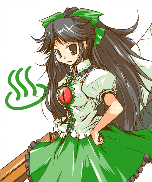 1girlarm cannonblack eyescenter frillscowboy shotfemale focusfrillsgreen skirthand on own hiplong hairlooking at viewerponytailpuffy short sleevespuffy sleevesshort sleevesskirtsoloswept bangsthird eyevery long hairweapon