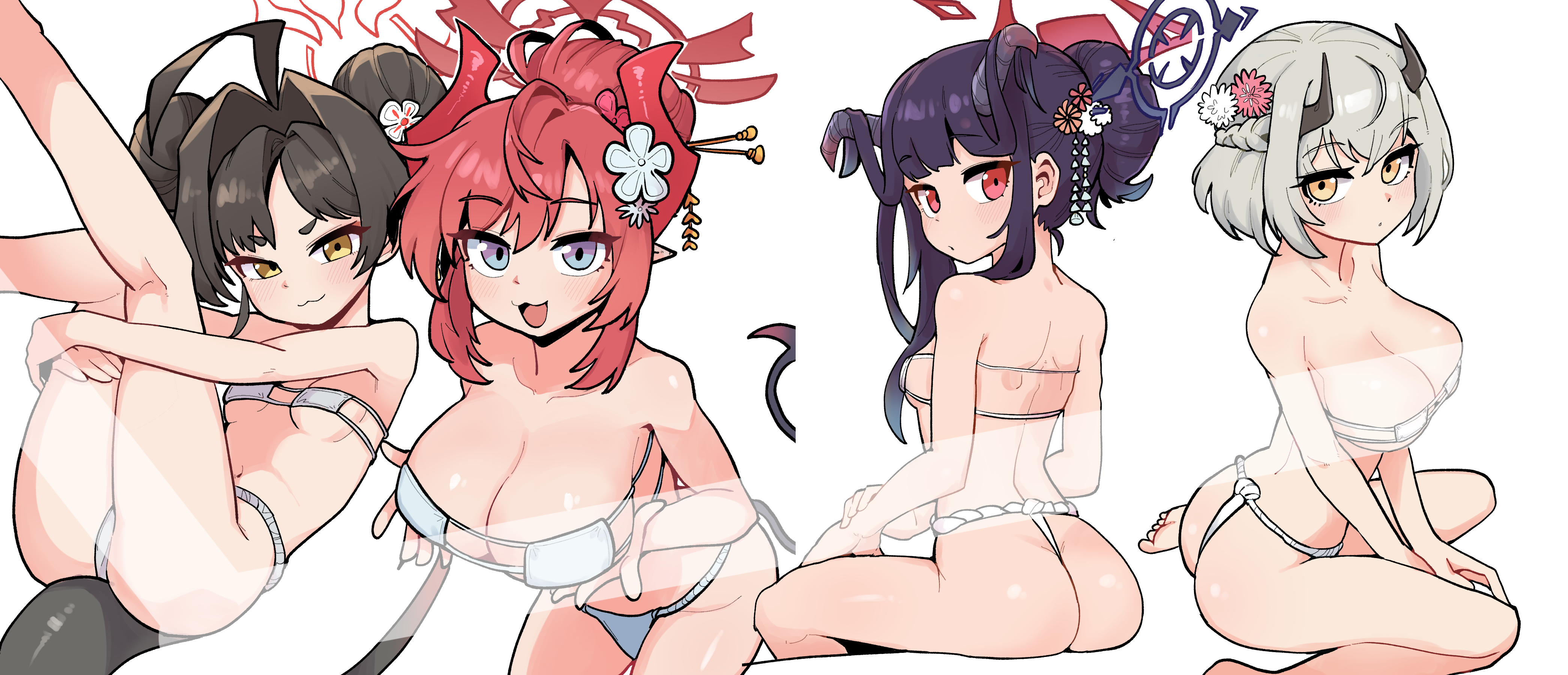 4girlsahogeassbikiniblack hairblue eyesbreastscleavagedemon hornsdemon taildouble buneyepatch bikiniflowergrey hairhair bunhair flowerhair intakeshair ornamenthalohornslarge breastslegs uplong hairlooking at viewermultiple girlsopen mouthpointy earsred eyesred hairred haloshort hairsittingsmall breastssmileswimsuittailtransparent backgroundwarizawhite bikiniyellow eyes