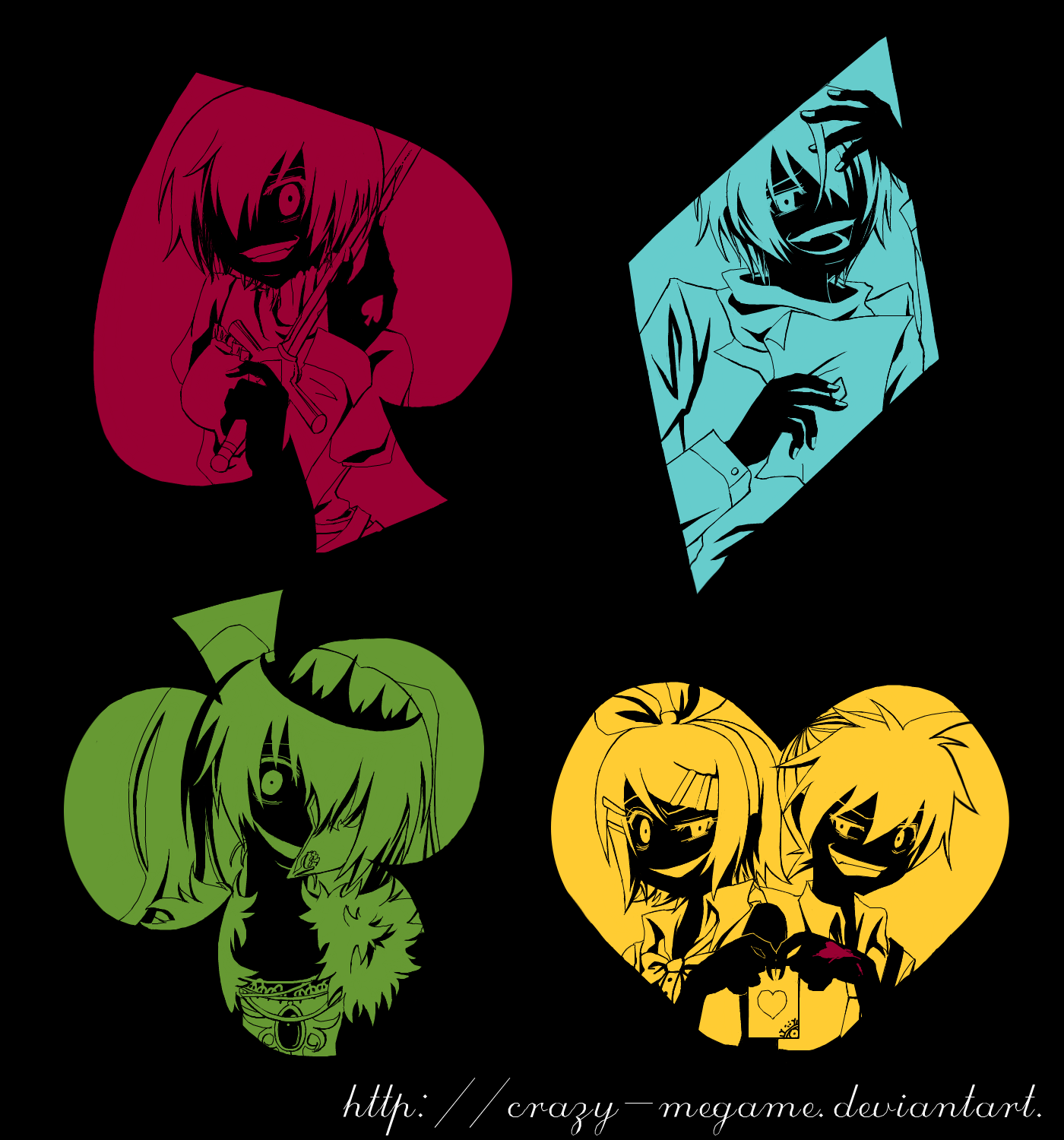 2boys3girlscardclub (shape)crazy eyescreepydiamond (shape)heartholdingholding cardhorror (theme)monochromemultiple boysmultiple girlsmultiple monochromeplaying cardsmilespade (shape)swordweapon
