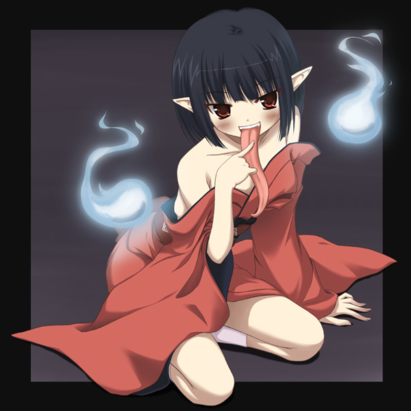 1girlbare shouldersblack borderblack hairblushborderfemale focushitodamajapanese clotheskimonolong tonguemonster girloutside borderpointy earsred eyesshort hairsockssolotonguetongue outundressing