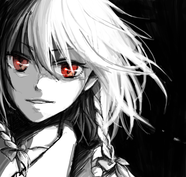 1girlblack backgroundbraideye focusfemale focushigh contrastmonochromeoekakired eyessimple backgroundsolospot colortwin braids