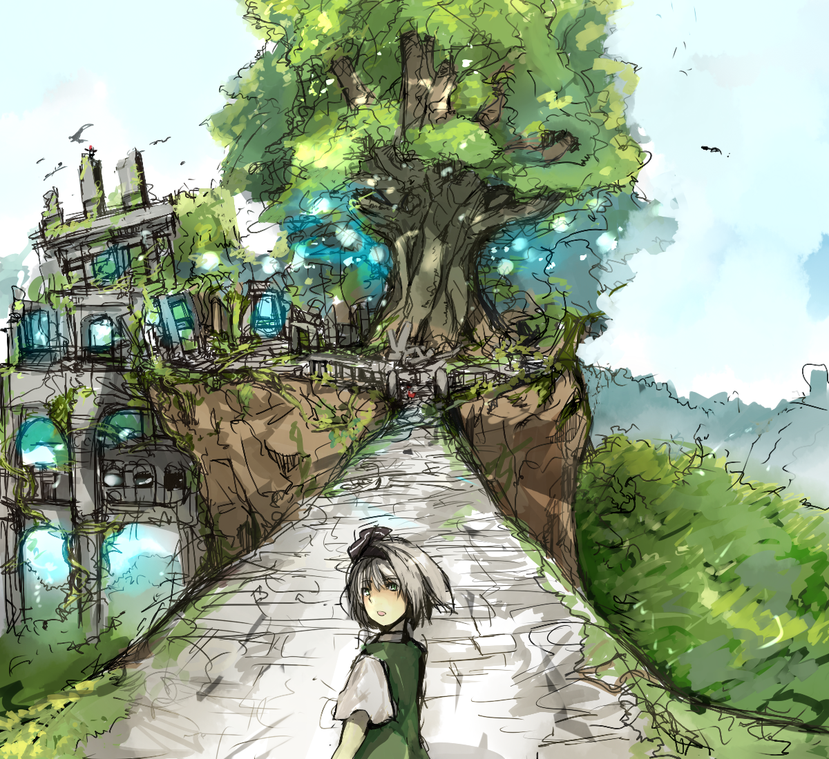 1girlbad anatomybirdbridgedayfemale focusgreen eyeslandscapenatureoutdoorsplantribbonscenerysketchskysolotree