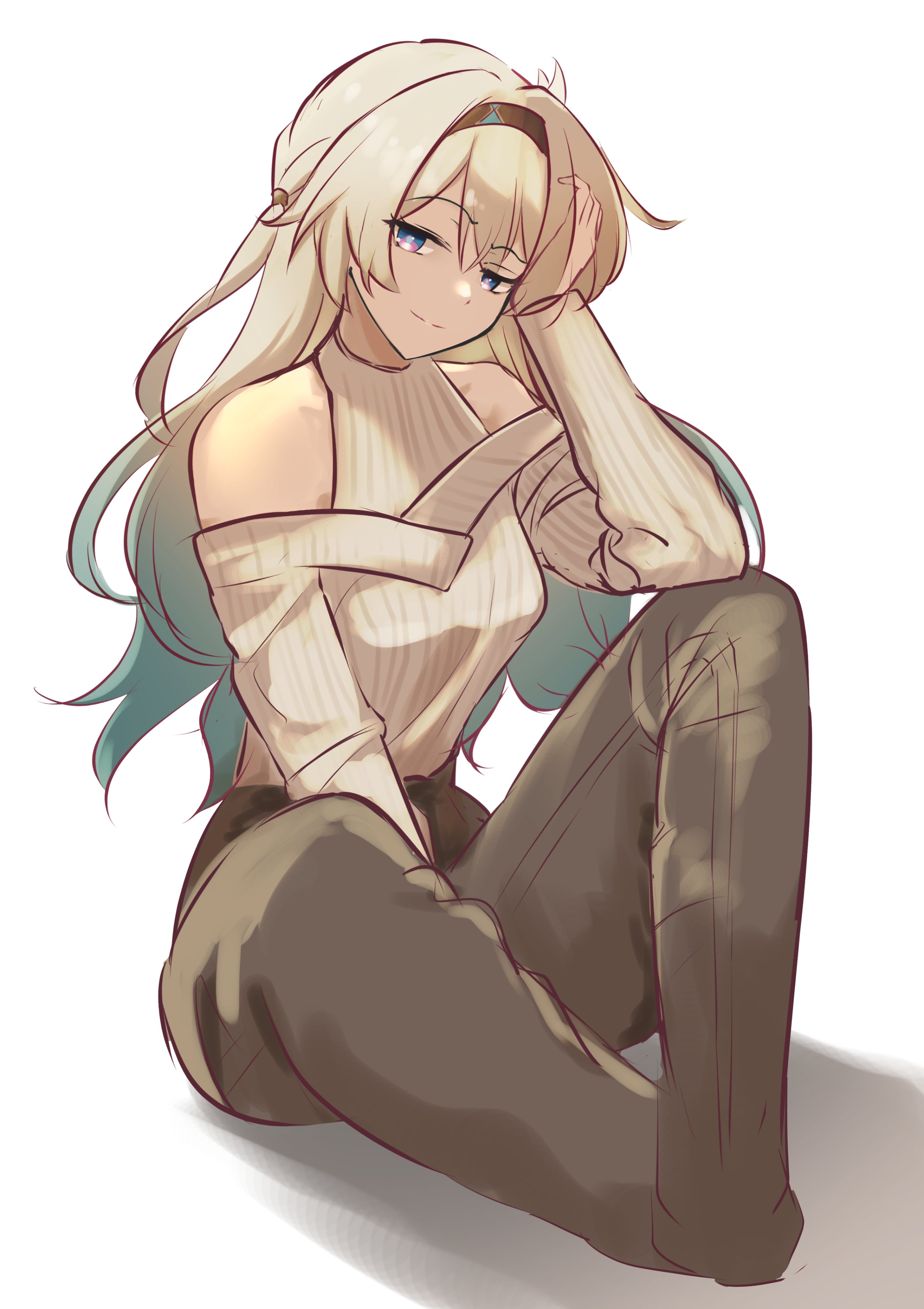 1girlalternate costumeblack hairbandblue pupilsgradient eyesgradient hairgrey hairhair intakeshairbandhand in own hairmulticolored eyesmulticolored hairsimple backgroundsolotwo-tone eyeswhite background