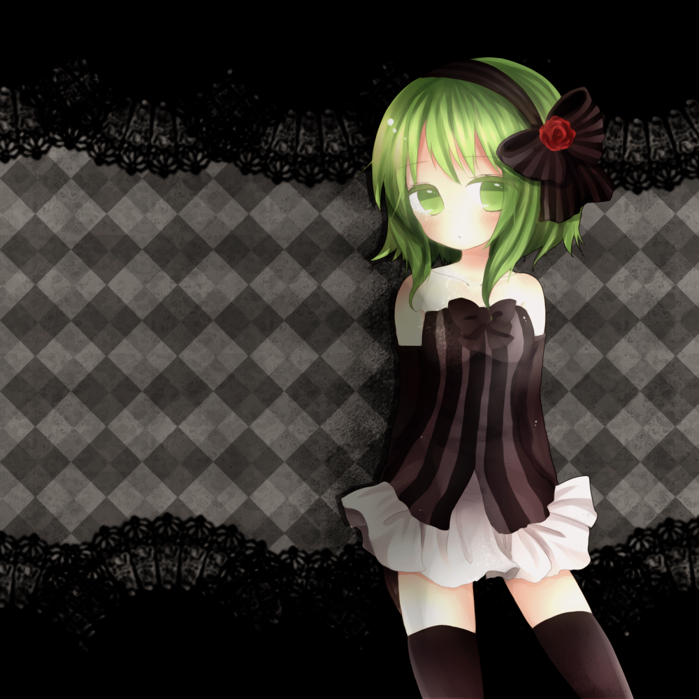 1girlbare shoulderselbow glovesfemale focusflowerglovesgoth fashiongreen eyesgreen hairhair ribbonmatching hair/eyesribbonroseshort hairskirtsolothighhighszettai ryouiki