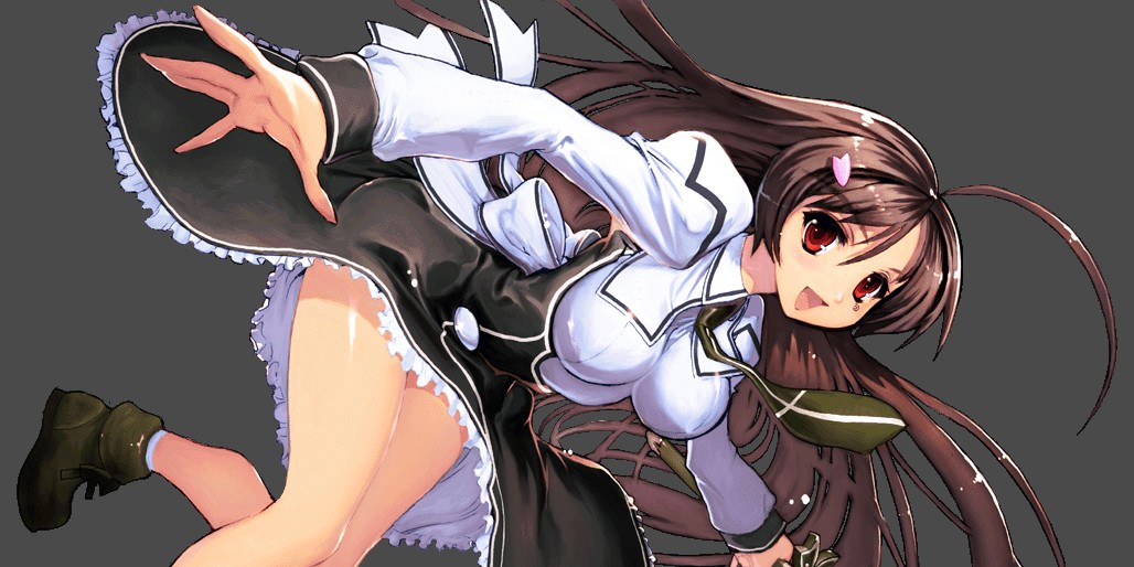 ahogebreastsbrown hairdutch angleforeshorteningfrillshair ornamenthaircliplarge breastslong hairnecktiered eyessimple backgroundskirtsolo