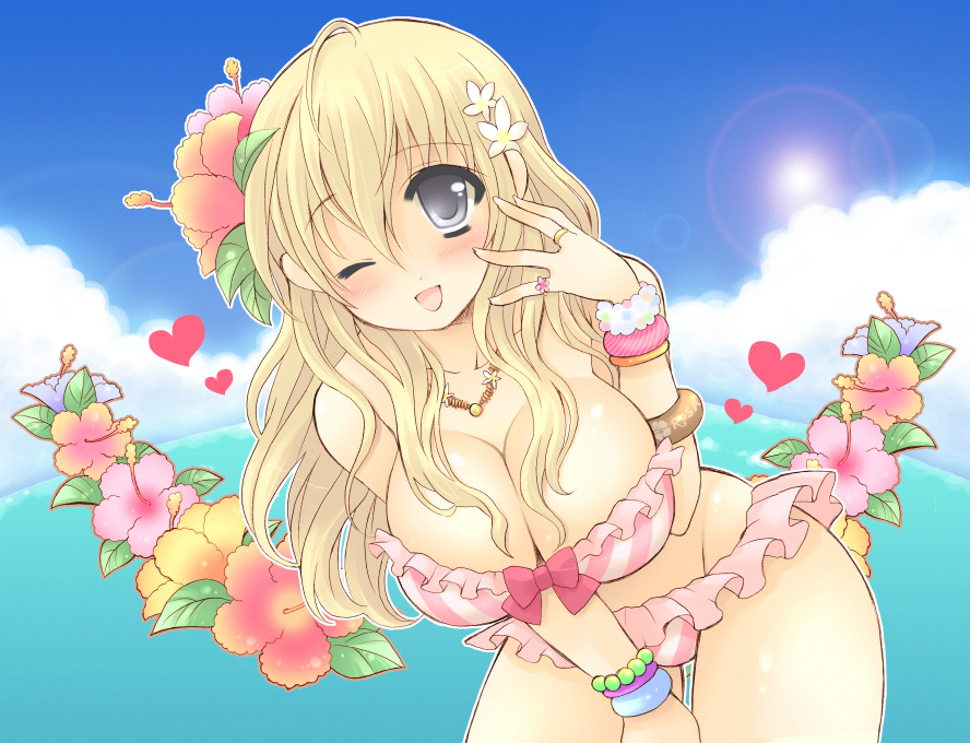 00s1girlbeachbikiniblack eyesblonde hairblushbraceletbreastscleavageclouddayfemale focusflowerfrillshearthuge breastsjewelryleaning forwardlens flareone eye closedopen mouthoutdoorsringskysolosunswimsuitwink