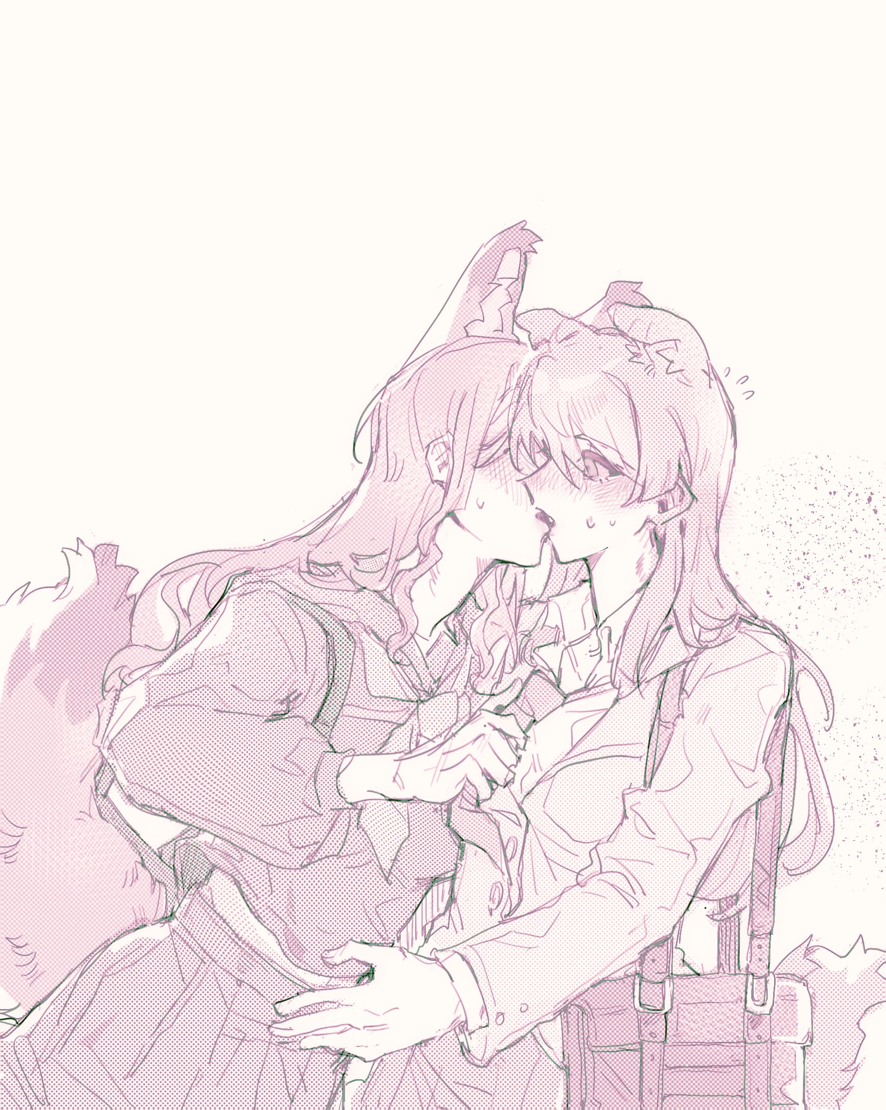2girlsanimal earsbagblushclothes grabcollared shirtdog earsdog girldog tailfangfox earsfox girlfox tailfrench kisshand on another's waisthaneoka school uniformhickeyjacketkemonomimi modekissmonochromemultiple girlsnecktienecktie grabneckwear grabpleated skirtschool bagschool uniformserafukushirtskirtsweattailtsukinomori school uniformyuri