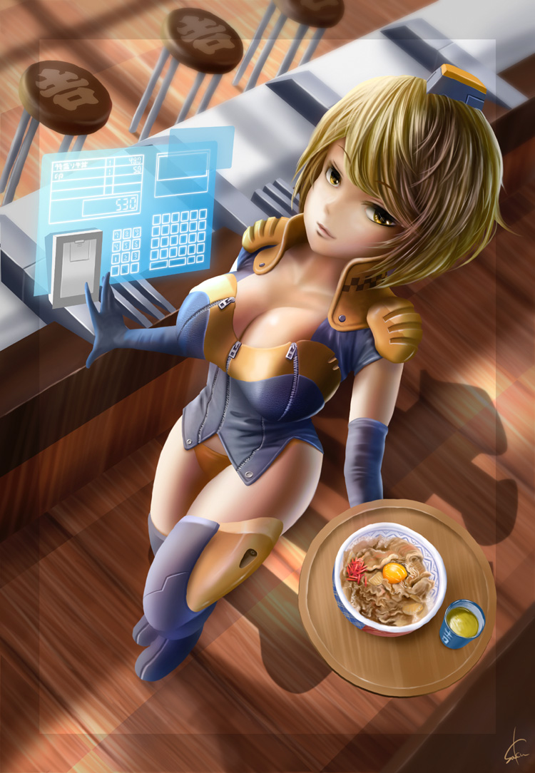 1girlbikinibikini bottom onlyblonde hairbreastscleavagecurvyelbow glovesfemale focusfoodgloveshuge breastsindoorsshort hairsoloswimsuitthighhighstrayyellow eyes