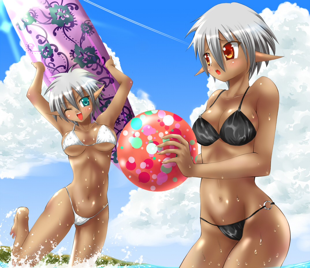00s2girlsballbeachballbikinidark skindark-skinned femalegenderswapgreen eyesmultiple girlsorange eyespointy earssplashingsurfboardswimsuitwadingwink