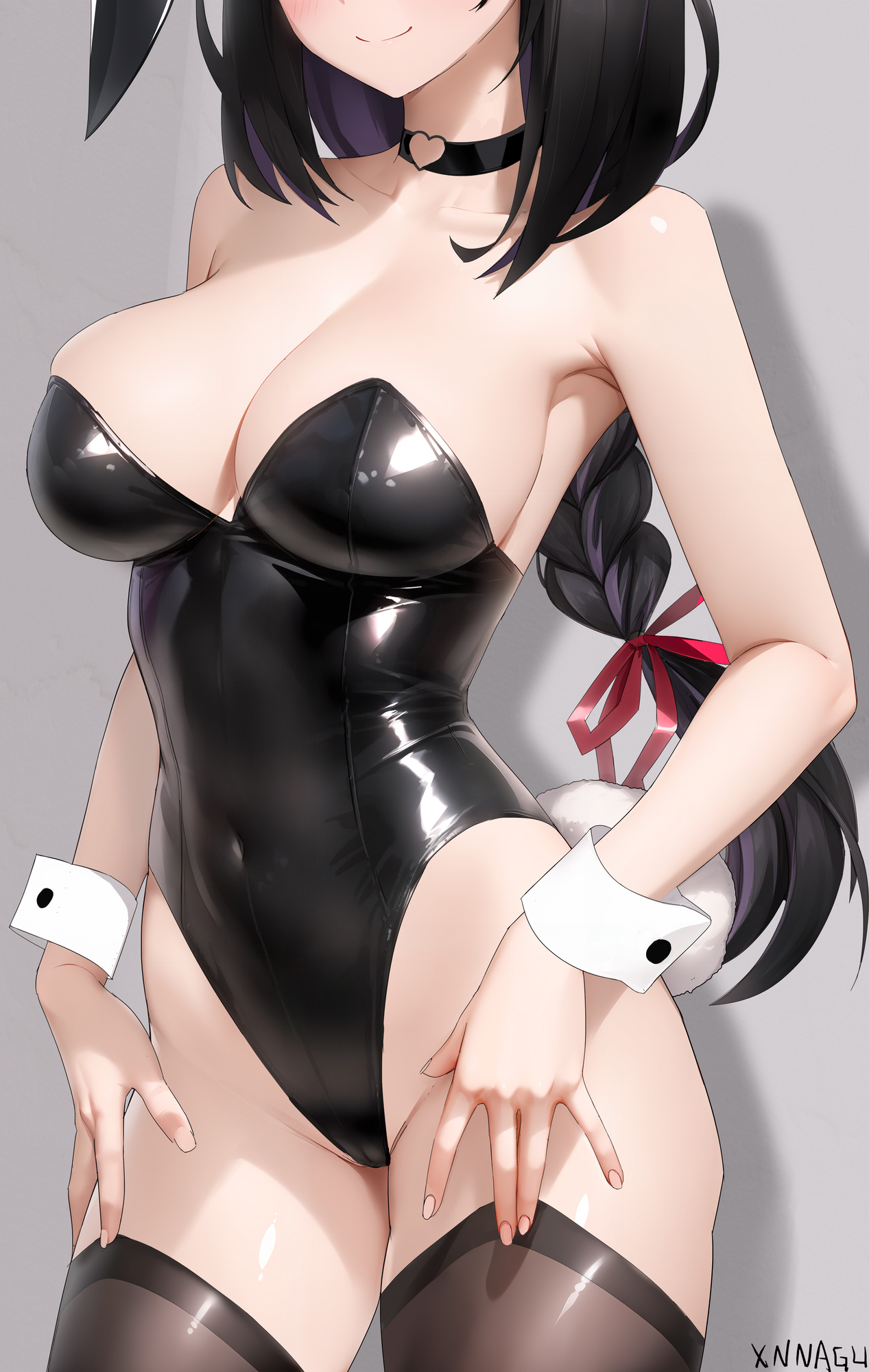 1girlanimal earsarmpitsbare armsbare shouldersblack hairblack leotardbraidbraided ponytailbreastsbrown thighhighschokercleavageclosed mouthcollarbonecovered navelcowboy shoteyes out of framefake animal earsfake tailfingernailsgrey backgroundhair ribbonhead out of frameheartheart chokerhighleglarge breastsleotardlong fingernailsmedium hairplayboy bunnyrabbit earsrabbit tailred ribbonribbonshiny clothessimple backgroundsingle braidskindentationsmilesolostraplessstrapless leotardtailthighhighsthighswhite wrist cuffswrist cuffs