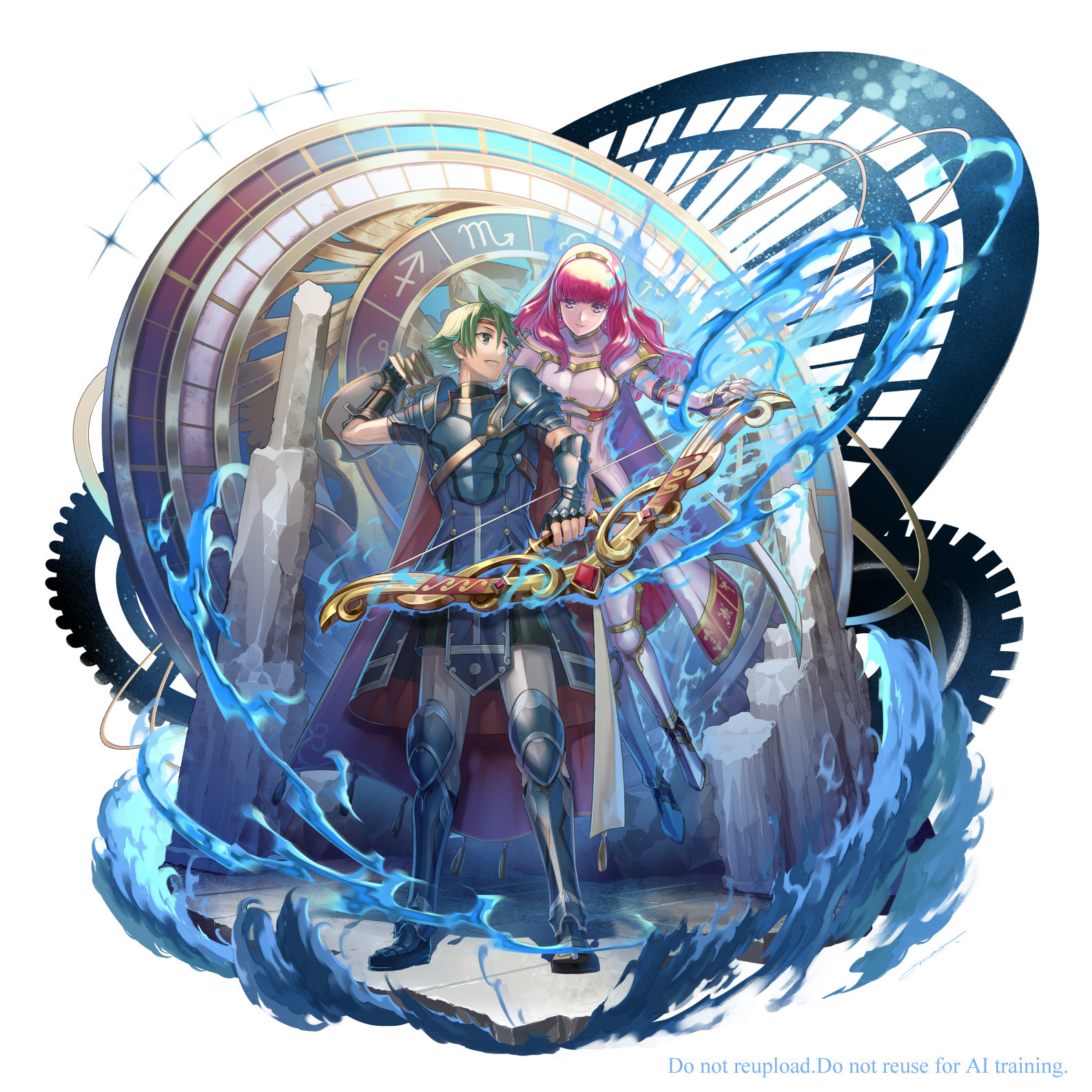 1boy1girlarmorbreastplatecapeenglish textfingerless glovesglovesgreavesgreen eyesgreen hairhairbandheadbandholdinglong hairparted lipspauldronsred eyesred hairsabatonshort hairshoulder armorsmilewaterweapon