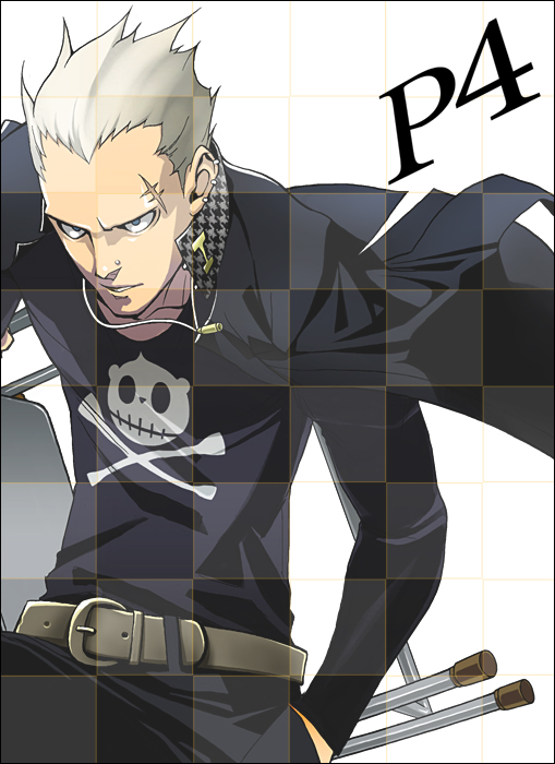 1boybeltblue eyesbulletchaircowboy shotcropped legsdelinquentdeskhair slicked backjewelrymale focusnecklacescarschool uniformshort hairskullsolo