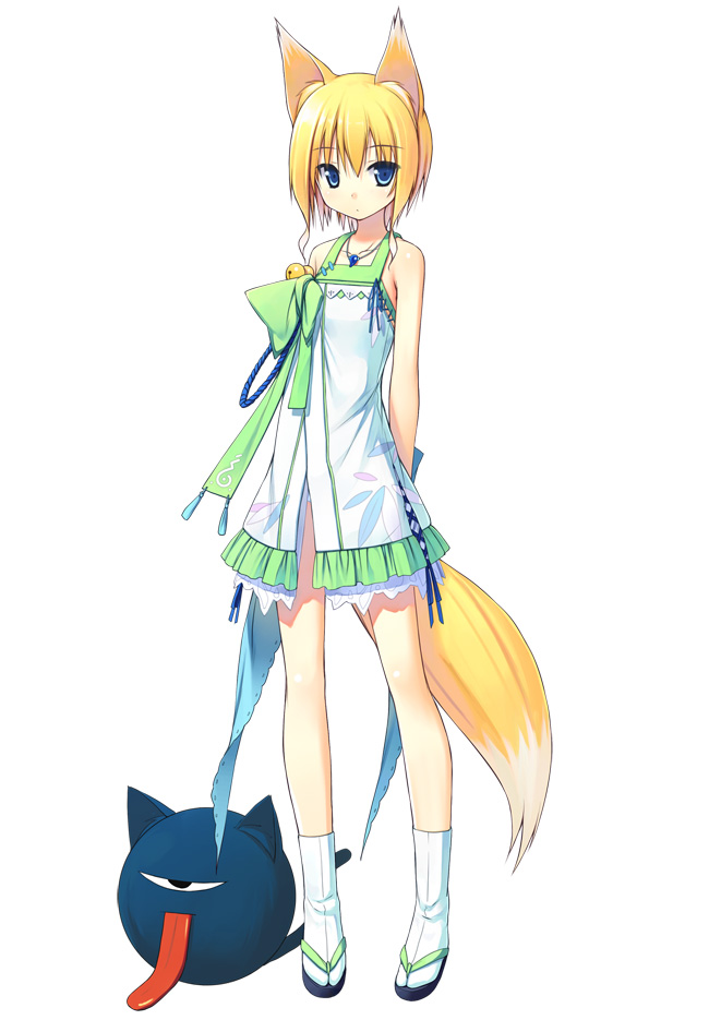 1girlanimal earsarms behind backbare legsbare shouldersbellblonde hairblue eyesdressfemale focusfox earsfox tailjewelryjingle bellpantiespantyshotpendantpetticoatsandalsshort dressshort hairside slitsimple backgroundsolostandingtabitailunderwear