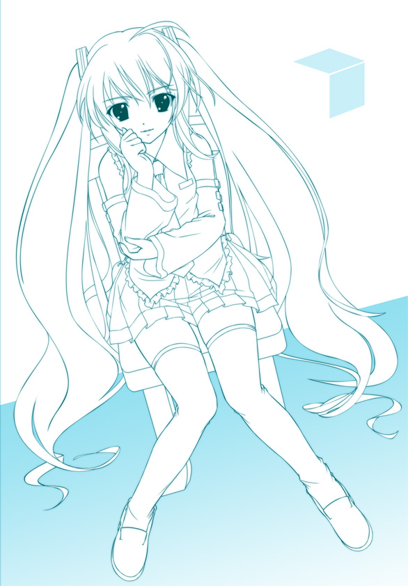 1girlblue themedetached sleevesfemale focuslong hairmonochromeskirtsolothighhighstwintailsvery long hairzettai ryouiki