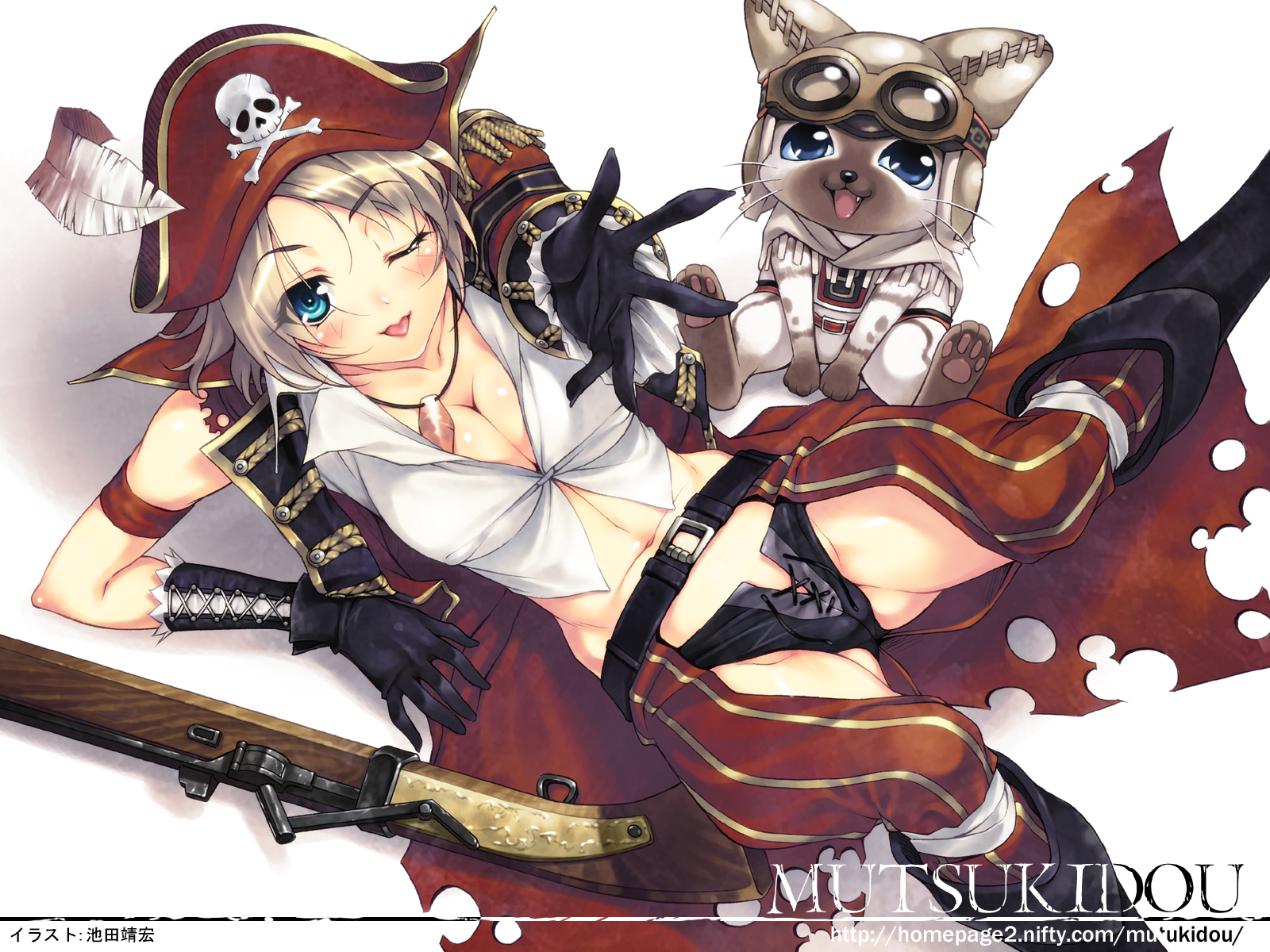 1girlbeltblonde hairblue eyesbreastscameltoecatchibikemocleavagecovered erect nipplesfangfemale focusglovesgogglesgunhatjewelrynecklaceone eye closedpiraterifleshort hairsolotongueweaponwink