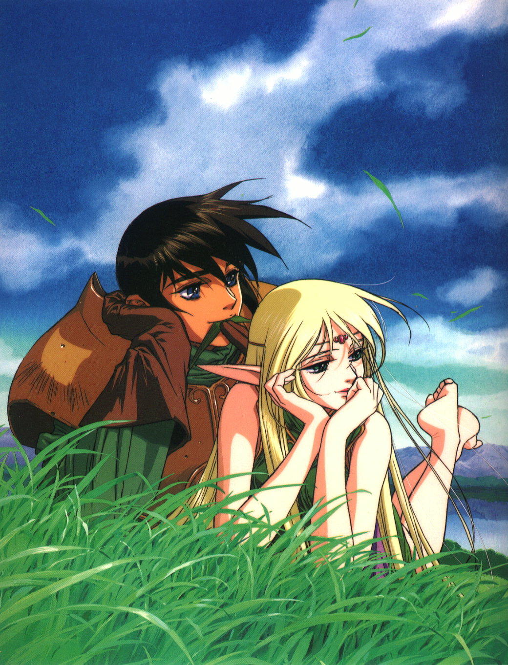 1990s (style)1boy1girlarmorbarefootblonde haircircletcoupleelffantasygreen eyesheterolong hairpointy earsretro artstyle