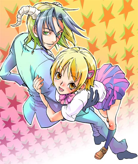 00s1boy1girlblonde hairblushcolored bangscoupleformal clothesglovesgreen hairhair ornamenthairclipheterohornshugmulticolored hairpleated skirtribbonschool uniformskirtsmilestar (symbol)suittwo-tone hairyellow eyes