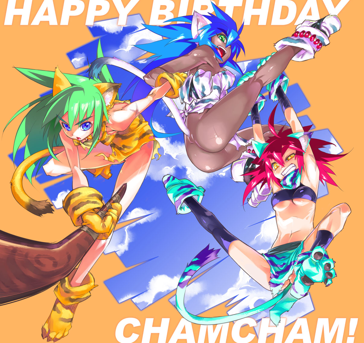 3girlsalternate coloranimal earsanimal handsanimal printassblue eyesblue hairboomerangbreastsdark skindark-skinned femaleglovesgreen eyesgreen hairmedium breastsmultiple girlspaw glovespaw shoesplayer 2red hairshoestailtiger printunderboobweaponyellow eyes