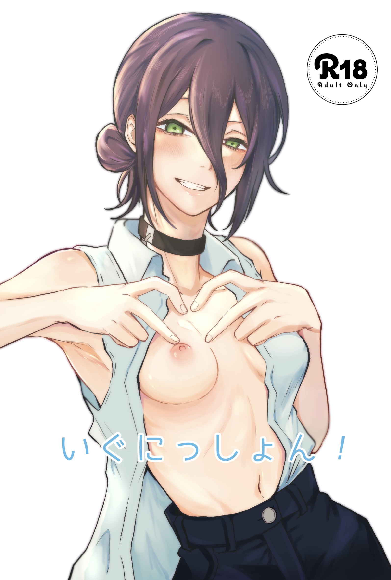 1girlblack chokerbreastschokercollared shirtgreen eyesgrenade pinhair between eyeshair bunlooking at vieweropen clothesopen shirtpurple hairshirtsmall breastssolowhite shirt
