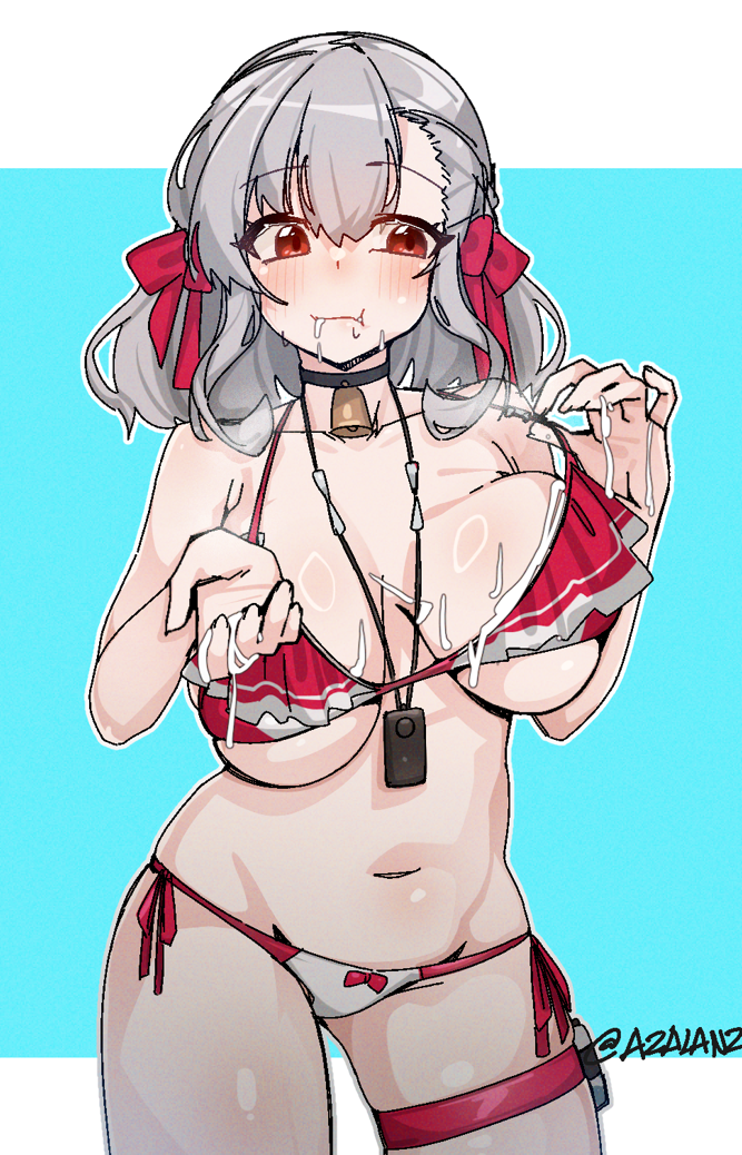 1girlbare shouldersbellbikiniblack chokerblue backgroundblushbowbow bikinibreastschokerclosed mouthcollarbonecowbellcumcum in mouthcum on bodycum on breastscum on handscum on upper bodyfrilled bikinifrillsgrey hairhair between eyeshair bowholding straphuge breastsmedium hairnavelneck bellpenispouchred bikinired bowred eyesside-tie bikini bottomsolostomachswimsuitthigh pouchthigh strapthighstwitter usernametwo-tone backgroundwhite background