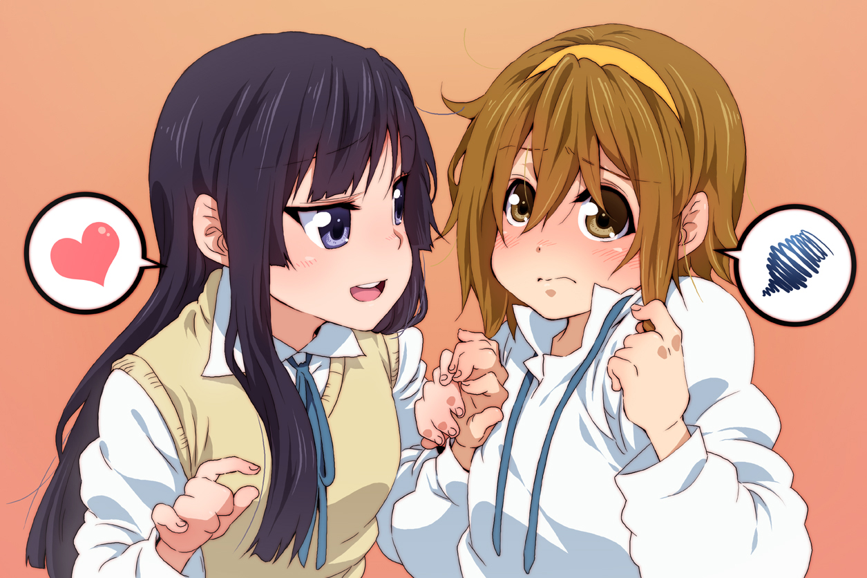 00s2girlsalternate hairstyleblack hairblue eyesblushbrown eyesbrown hairhair downhairbandheartholding handslong hairmultiple girlsschool uniformshort hairshysweater vesttomboy