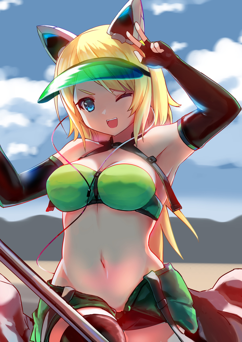 1girlanimal earsbare shouldersblack thighhighsblonde hairblue eyesbrabreastscloudfake animal earsfingerless glovesglovesgreen bralarge breastslong hairlooking at viewernavelone eye closedopen clothesopen mouthskysmileteeththighhighsunderwearupper teeth onlyvvery long hair