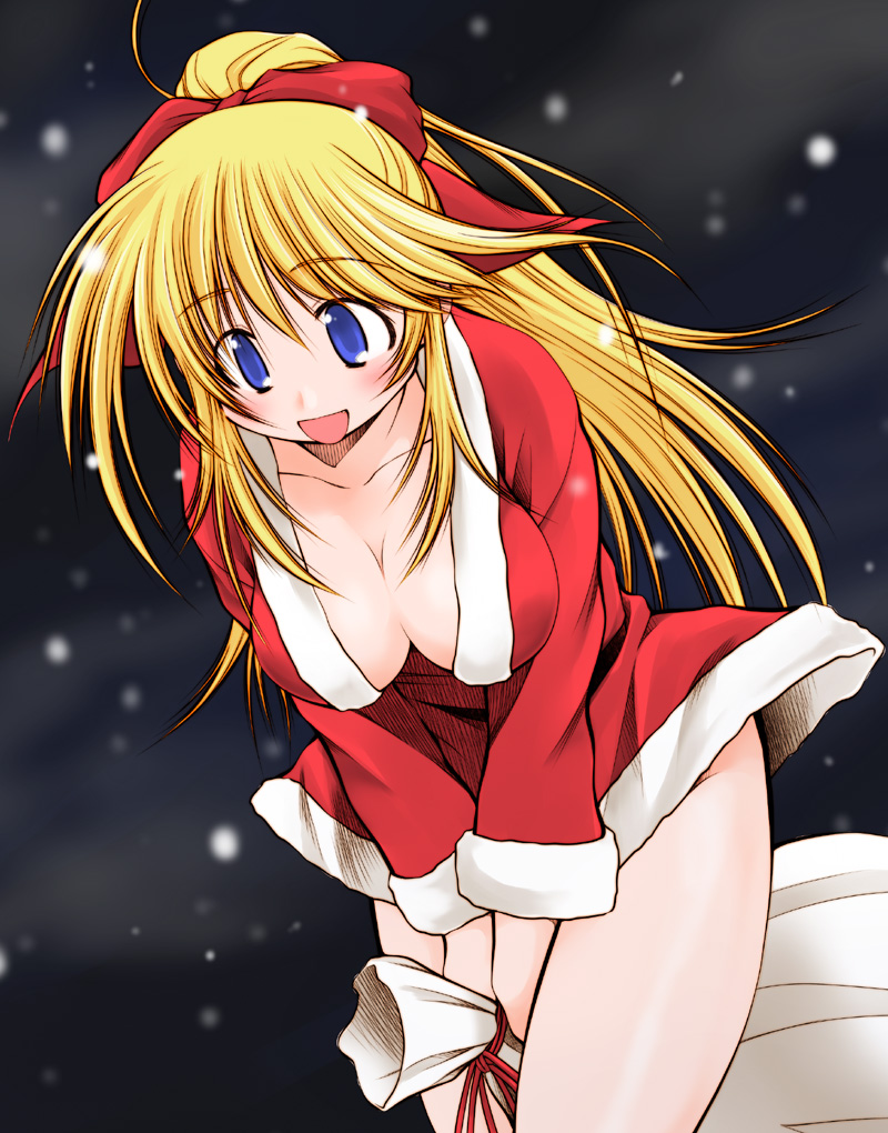 1girlbagbetween legsbetween thighsblonde hairblue eyesblushbowbreastschristmascleavagecollarbonefemale focusfur trimgift baghair bowhair ornamentlarge breastsleaning forwardlegs togetherlong hairlong sleevesopen mouthponytailsacksanta costumesolothighs