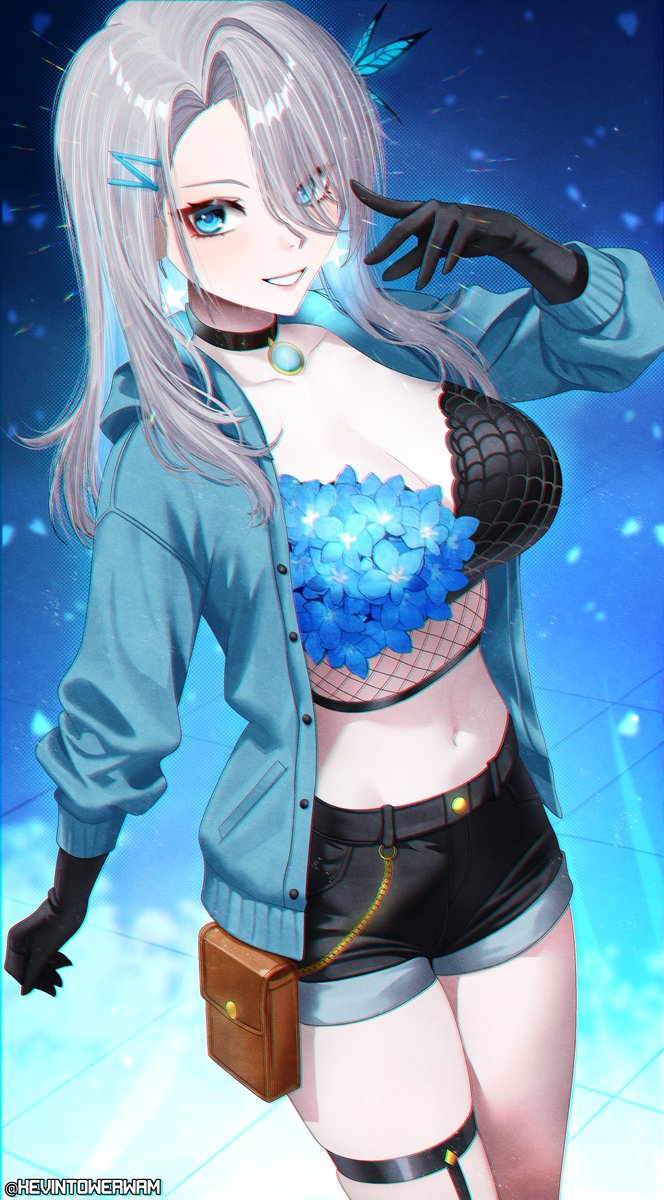 1girlalternate costumeblack glovesblack shortsblue eyesblue jacketbutterfly hair ornamentfishnet topfishnetsglovesgrey hairhair ornamenthair over one eyejacketlong hairnavelparted lipsshortsthigh straptile floortilestwo-tone bravirtual youtuber