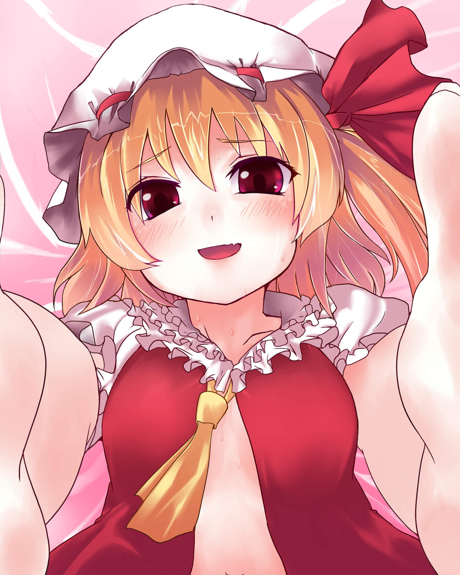 1girlblonde hairblushfemale focushatlyingon backone side upopen clothesopen shirtponytailpovred eyesshirtshort hairside ponytailsolosweat