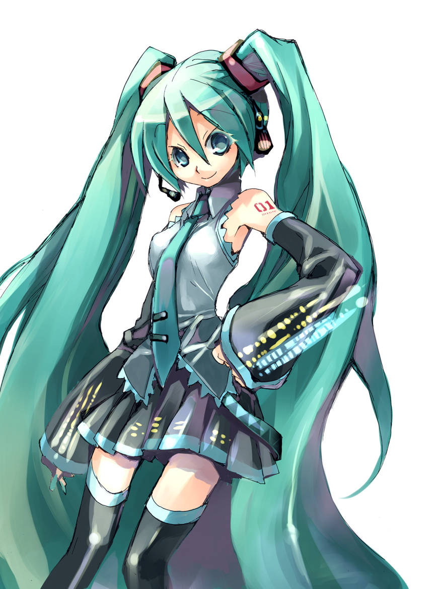 1girlaqua eyesaqua hairdetached sleevesfemale focusheadphonesheadsetlong hairnecktiesimple backgroundskirtsmilesolothighhighstwintailsvery long hairzettai ryouiki