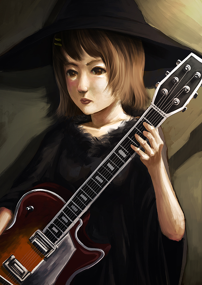 00s1girlbrown eyesbrown hairfaux traditional mediafemale focusguitarhatinstrumentlipstickmakeupportraitrealisticsolospeed painting