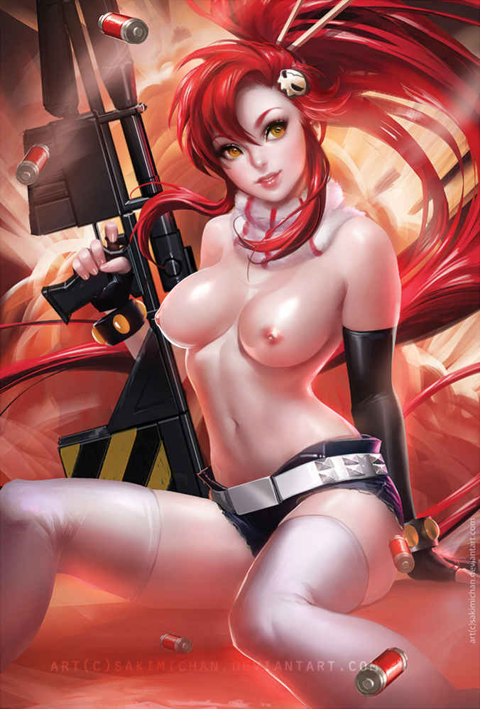 1girlsbreastsfemalefemale onlyFlag for Deletiongloveshair ornamentlarge breastsnavelnipplesred hairscarfshortssittingsniper riflesolothighhighstoplessweaponyellow eyes