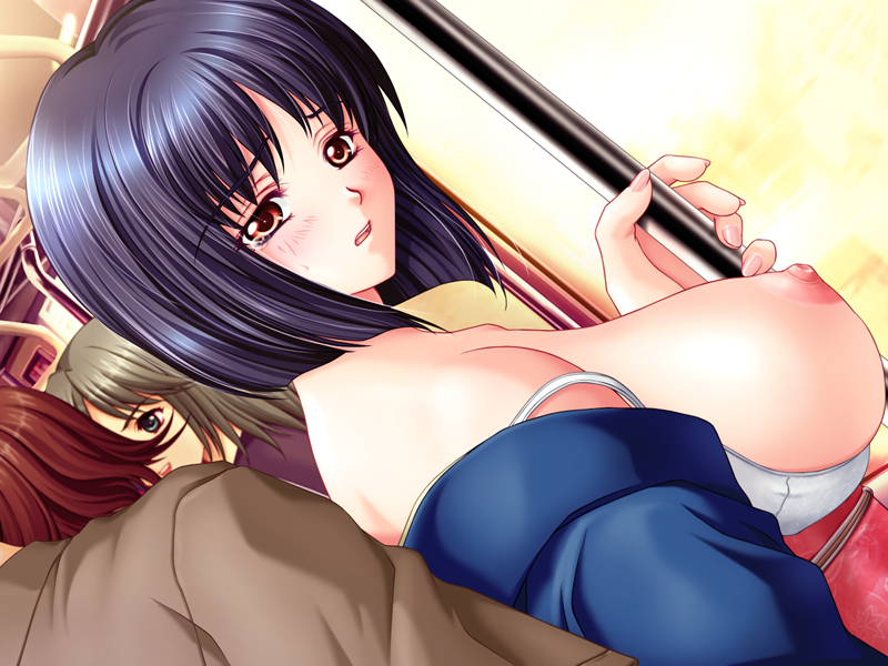 black hairbrabreastsbreasts outsidechikanfemaleFlag for Deletionjapanese clotheskimonolooking backnipplesred eyesshort hairtraintrain interior